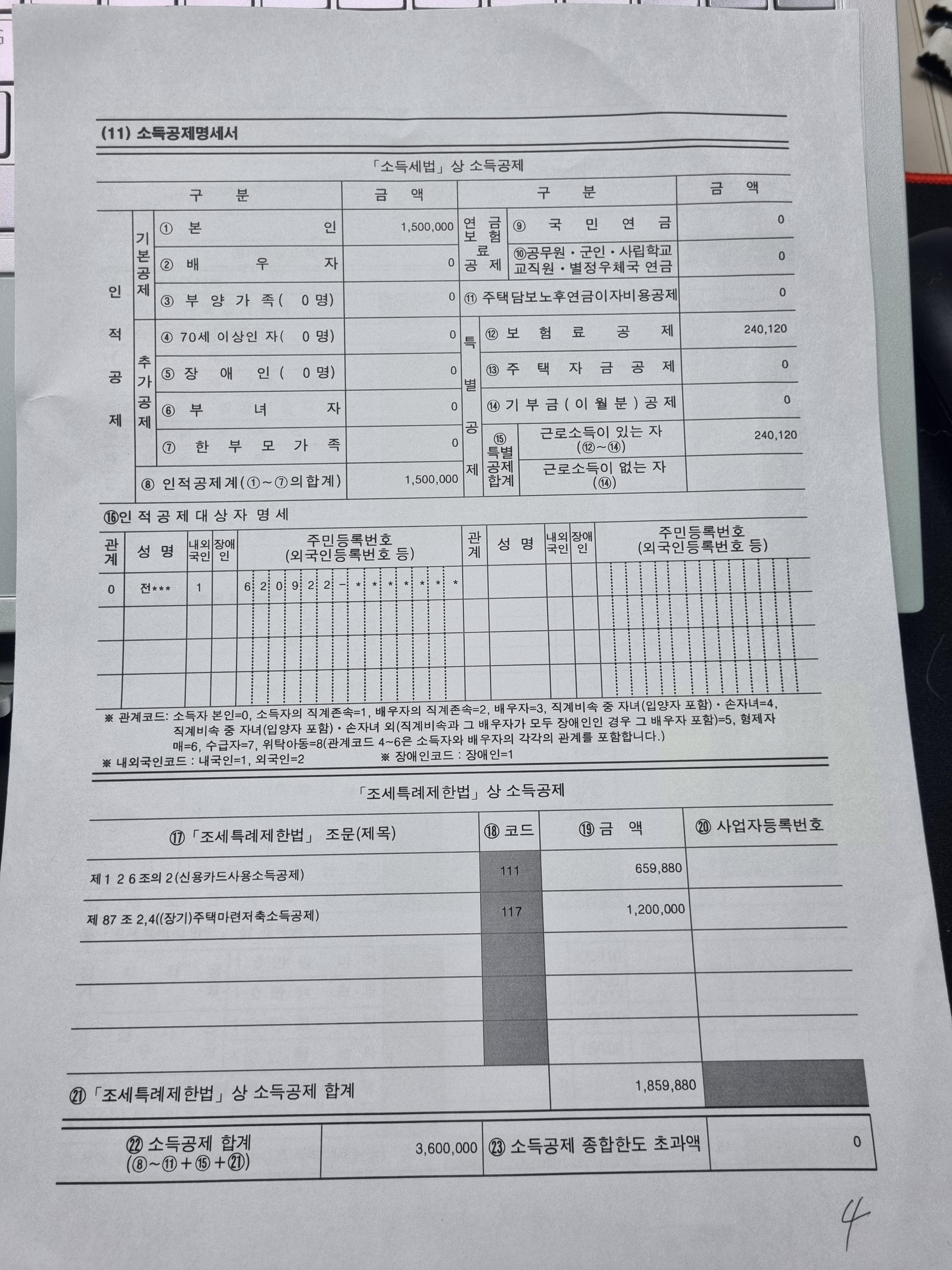 소득공제 사항을 잘 살펴보면 본인소득공제,배우자공제,연금보험료공제(국민연금과 공무원.군인.사립학교.교직원.별정 우체국 연금)이 있다. 특별 공제란에는 보험료 공제,주택자금 공제,기부금(이월분)공제,특별공제합계에는 근로소득공제와 근로소득이 없는 자가 있다.