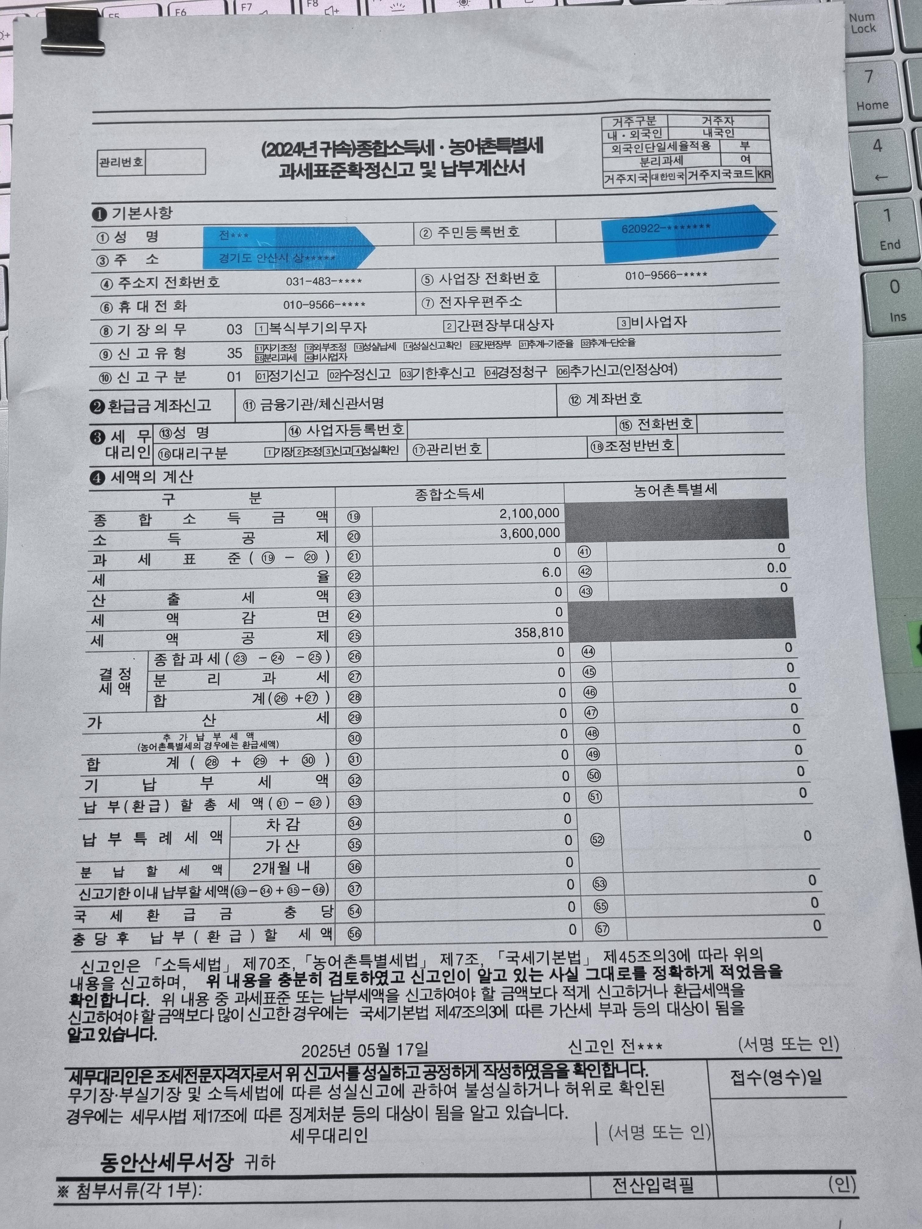 - 매출 정리, 비용 영수증 확보:신고시에 필수 제출서류가 있습니다. 홈텍스에서 파일을 다운로드 받으시면 됩니다. 저의 경우는 24년 귀속 소득.세액공제증명서류:기본내역(건강보험료):240,120,연금보험료573,820,실손보험1,245,840과 손해보험360,000입니다.의료비는 1,956,470,실손보험금 수령액은18,500,신용카드 사용은27,610,630으로 일번26,802,920과 전통시장255,450,대중교통115,800,도서공연등436,460합계27,610,630입니다. 직불카드 사용은 1,147,600,현금영수증은 1,303,070원입니다. 세액공제 증빙으로 정치자금기부금은 11,000입니다. 이것을 홈텍스 종합소득세 항목입력에 넣으시면 종소세가 자동계산이 됩니다.