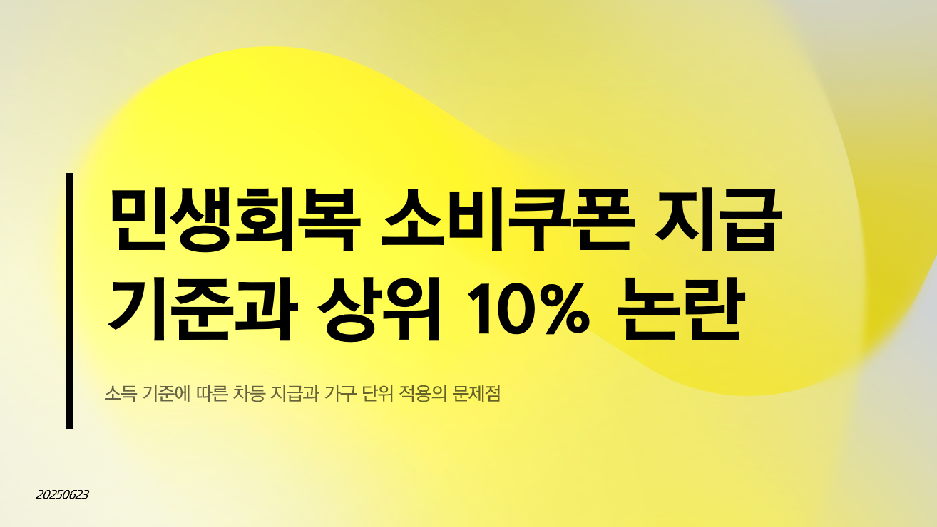 코로나19 이후 침체된 소비 회복을 위해 정부가 추진 중인 “민생회복 소비쿠폰”. 지급 대상과 지급 기준이 발표되면서, 특히 ‘소득 상위 10%’로 분류되는 이들에 대한 가구기준 적용 방식이 논란이 되고 있습니다.