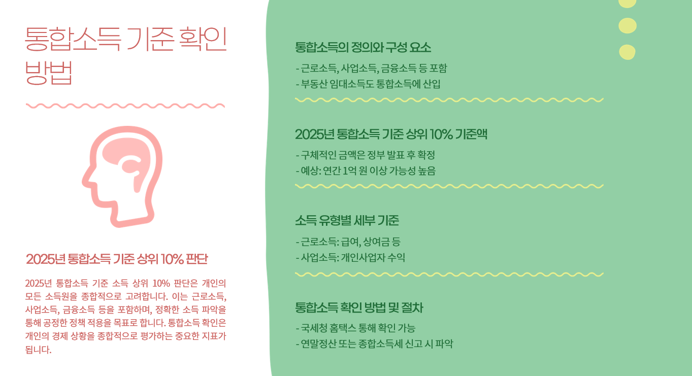 2025년 부와 성공을 평가하는 중요한 지표 중 하나인 ‘소득 상위 10%’. 이 글에서는 2025년 기준 통합소득 연 1.5억 원, 근로소득 연 9,600만 원(월 800만 원) 이상, 그리고 건강보험료 기준까지 실질적인 기준과 함께 내가 상위 10%인지 확인하는 방법을 알려드립니다. 이제 나의 위치를 객관적으로 확인해볼 시간입니다!