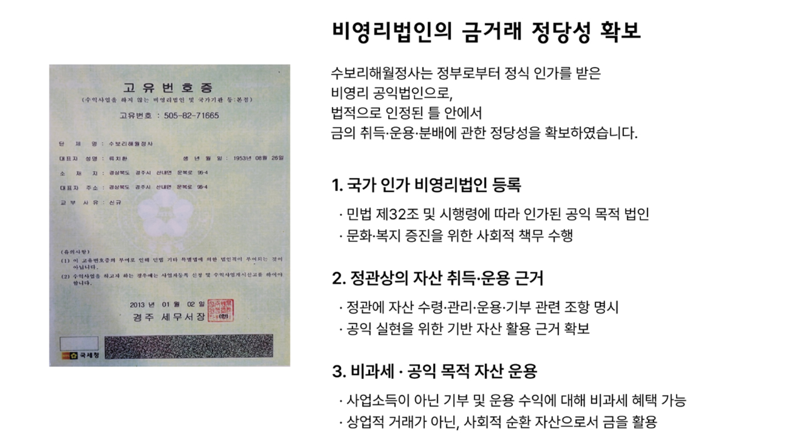 불교 정신과 예술 수행의 철학을 실천하는 수보리해월정사(비영리 공익법인)는 단순한 종교 단체를 넘어, 금(GOLD)을 기반으로 한 공익 자산화 모델을 국내 최초로 도입·운영하고 있습니다.