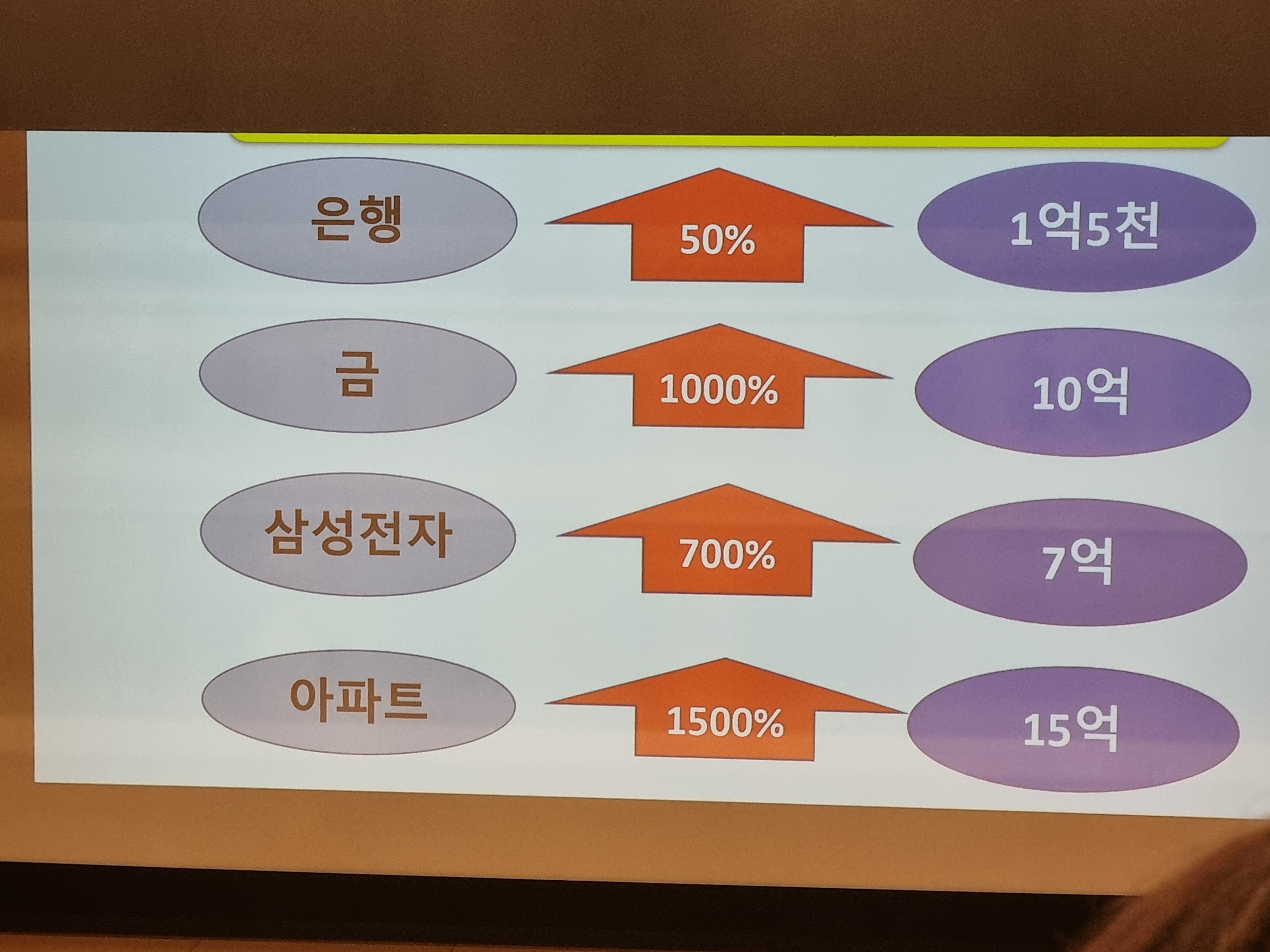 은행에 현금을 맡겨두었을때는 50% 올랐다. 금은 1,000%가 올랐다. 삼성전자 주식은700%가 올랐다. 아파트는 1,500%가 올랐다. 금과 아파트가 가장 오른셈이다.